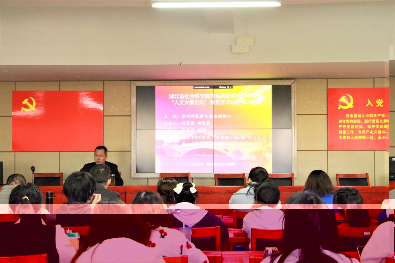 3月31日下午,由2003网站太阳集团主辦的“人文大家論壇”第240講于立言樓B4-1室舉行。湖北省社會科學院二級研究員劉保昌先生應邀為我院師生做題為“影響的焦慮與創造的雄心”的學術講座。本次講座由李勝清教授主持,劉郁琪、胡志明、梁小娟、鄧桂英等老師以及漢語言文學專業研究生和本科生到場聆聽。